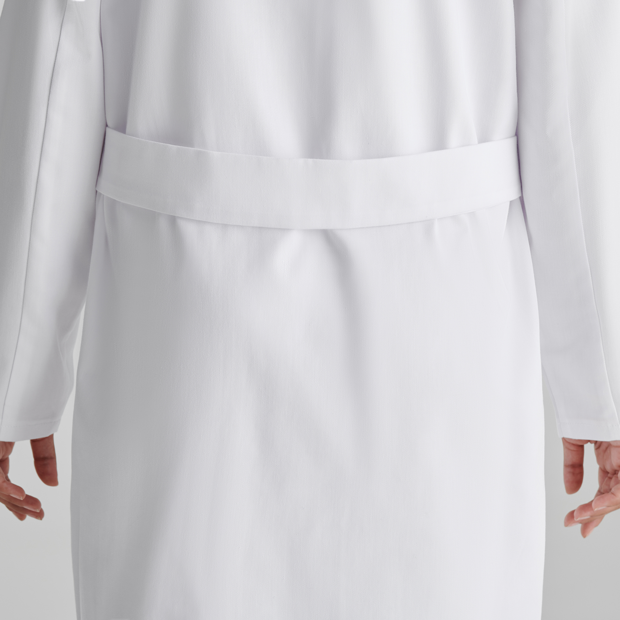 Bata de servicio de manga larga entallada. -Cuello con solapa. -Apertura central con 5 botones a tono. -Un bolsillo en pecho y dos laterales. -Cinturilla trasera.